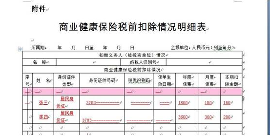例如:張三、李四在A公司上班,每月稅前工資5000元。張三自行繳納商業(yè)健康保險1800元/年,李四自行繳納商業(yè)健康保險3600元/年,兩人均需向單位財務(wù)提供帶“稅優(yōu)識別碼”的保單憑證,單位財務(wù)人員在報稅時需要在填報《扣繳個人所得稅報告表》申報表,稅前扣除項—“其他”欄次,并同時填報《商業(yè)健康保險稅前扣除情況明細(xì)表》