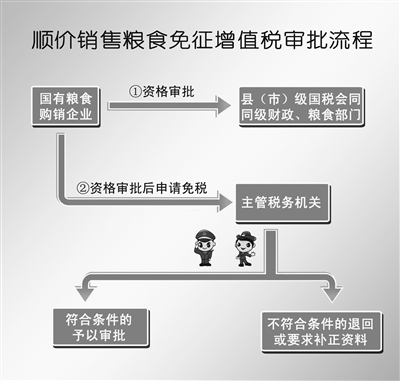 糧食企業(yè)免征增值稅實(shí)行先審批后減免。根據(jù)國稅發(fā)〔2005〕129號(hào)文件精神,符合上述免征增值稅條件的企業(yè)必須按照規(guī)定報(bào)經(jīng)有關(guān)部門審批后方可享受減免稅(流程見圖示),并按要求報(bào)送相關(guān)資料。