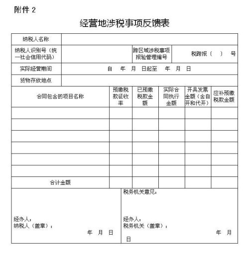 納稅人跨區(qū)域經(jīng)營活動結(jié)束后,應(yīng)當(dāng)結(jié)清經(jīng)營地的國稅機(jī)關(guān)、地稅機(jī)關(guān)的應(yīng)納稅款以及其他涉稅事項(xiàng),向經(jīng)營地的國稅機(jī)關(guān)填報(bào)《經(jīng)營地涉稅事項(xiàng)反饋表》(附件2)。